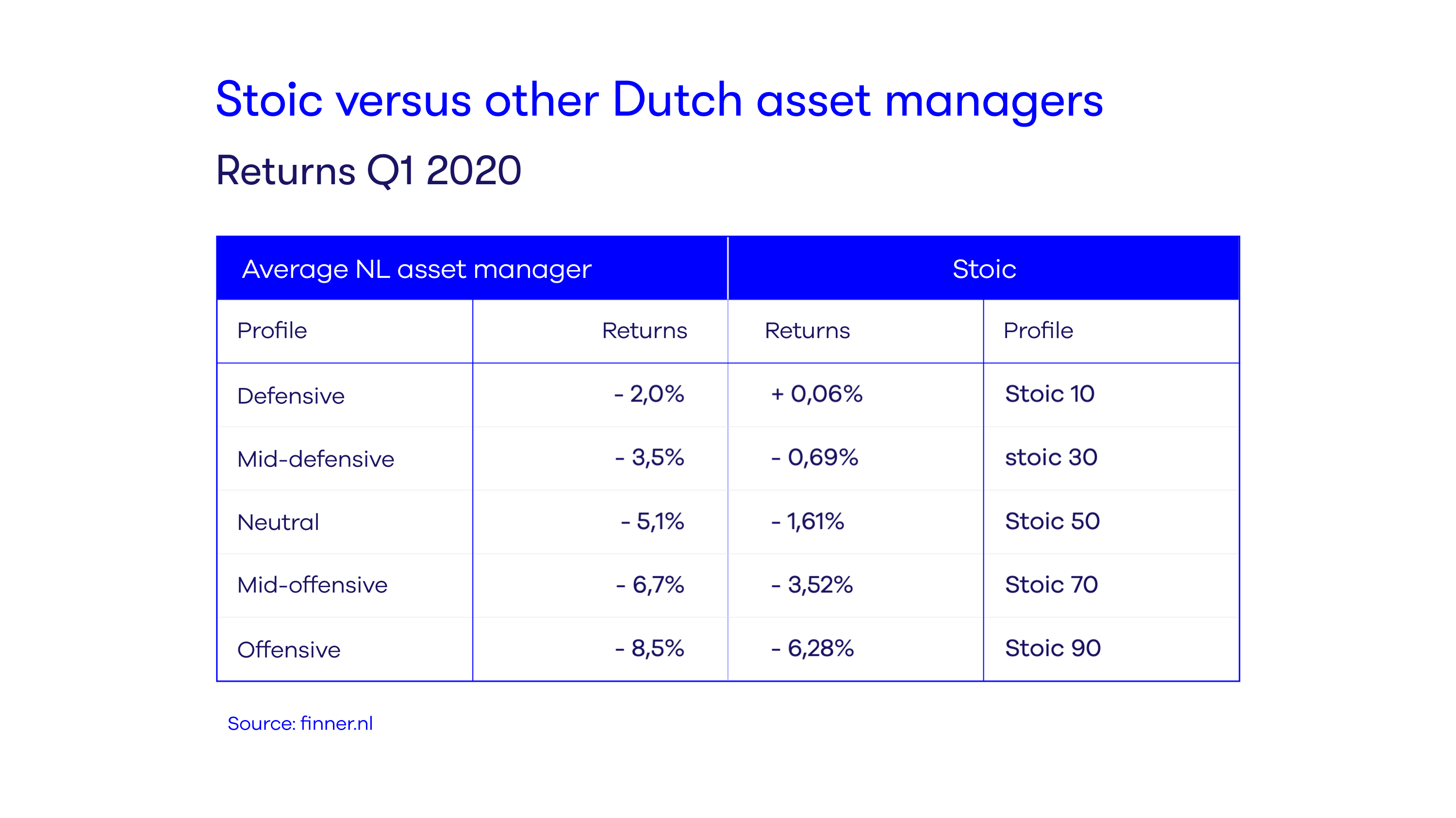 Let's take a look at the recent publication by asset management comparison site Finner.nl about the performance of Dutch asset managers in the first half of 2020. How is Calm Capital Control by Stoic performing during this crisis compared to the rest of the Dutch asset management sector? Who is best able to contain the damage? The facts speak for themselves; just take a look at the figures below: